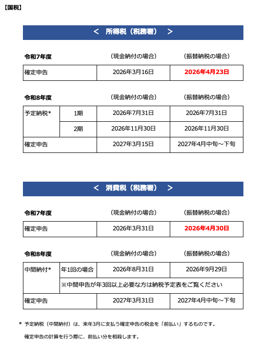 令和8年度・納税スケジュール【個人の納税者向け】