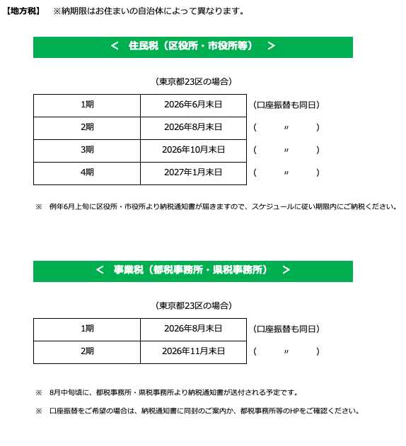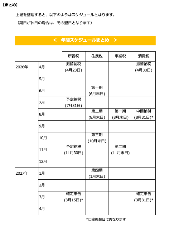 今後の納税スケジュールを整理しましたので、ご参考になさってください。