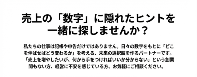創業間もない方、今の売上に不安を感じている方は、ぜひお気軽にご相談ください。